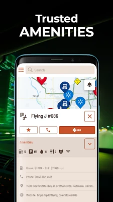 - Detailed POIs with diesel prices, hours of operation, click-to-call buttons, and amenity listings